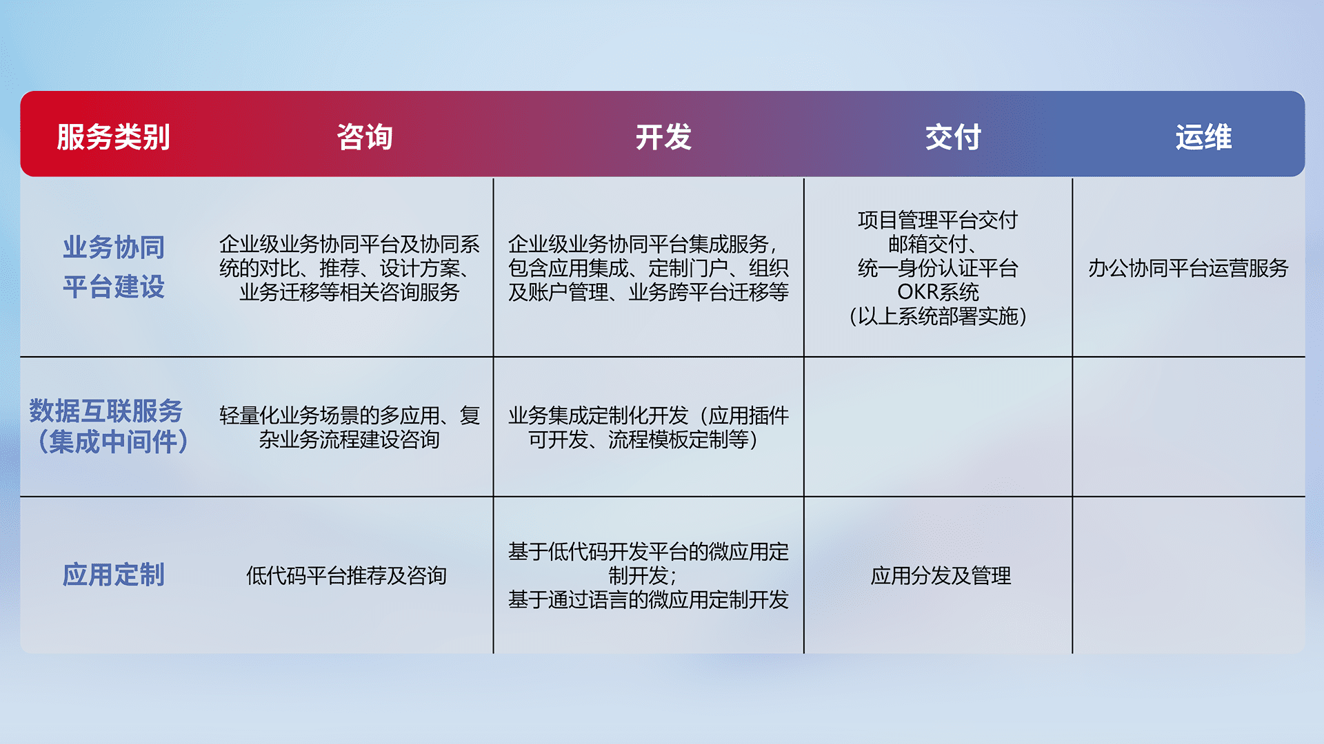 针对钉钉、、、、企微、、、IDaas等平台级产品提供产品的规划、、、、方案、、、交付、、、、定制化开发等服务,,实现如统一协同办公、、、、智能客户服务、、、、混合会议管理、、、、智能数据查询、、、、等业务场景,,,,实现数字化转型。。